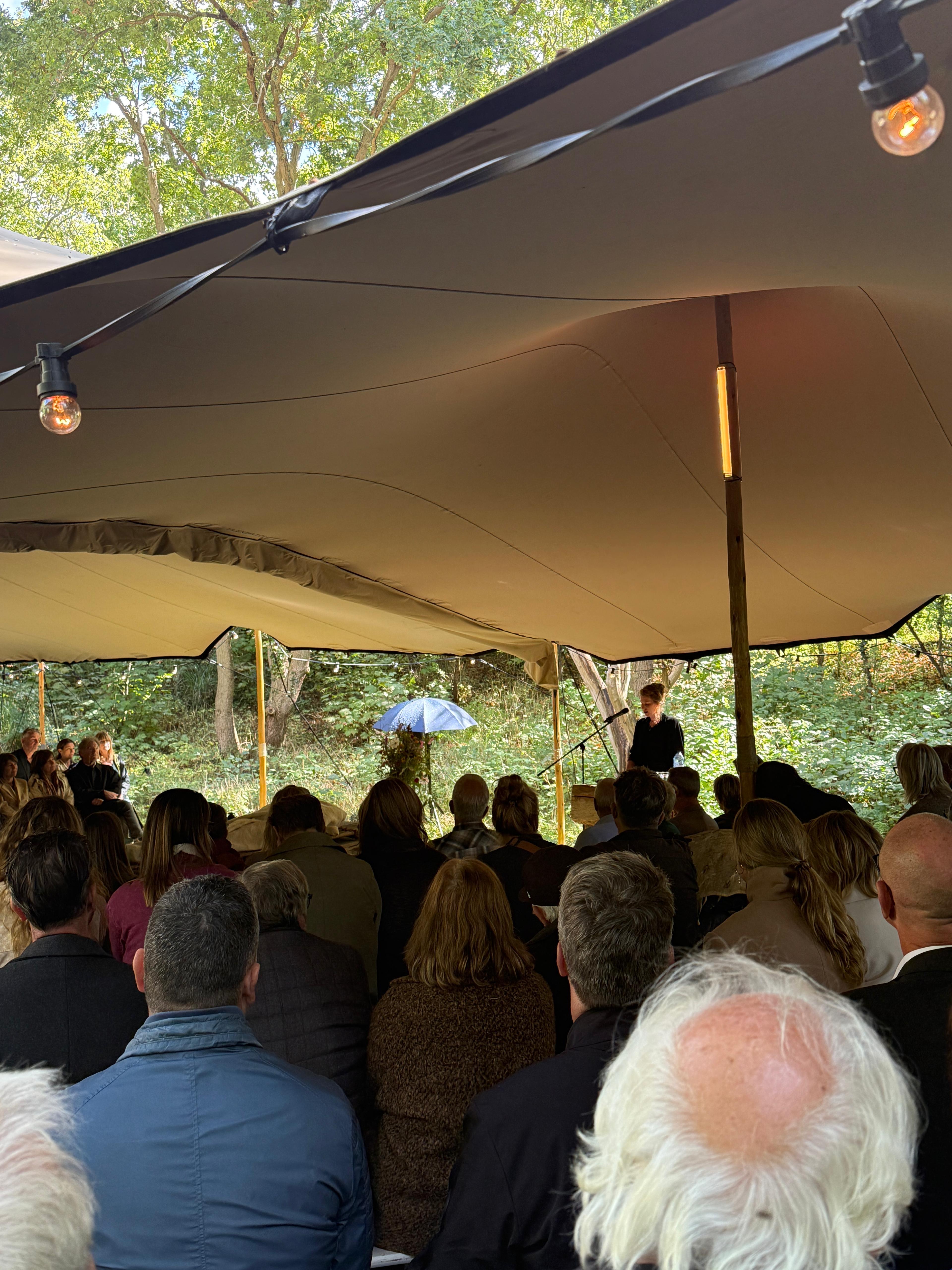 Het afscheid zelf zouden we in een thuissetting laten plaatsvinden. In de woonkamer of tuin. Met eigen muziek en fijn informeel: als er iemand wil spreken, zingen, muziek wil maken dan kan dat. Ik zou familie en vrienden vragen hun lievelingssnack of -gerechtje mee te nemen en deze tijdens het afscheid opdienen of uitdelen. Na afloop zou mijn dierbare met eigen vervoer (uit eigen bezit of geleend, een grote station, camperbusje of bestelwagen) naar Westerhout gaan. Familie en vrienden blijven fijn bij elkaar, zwaaien uit en maken misschien daarna een mooie wandeling of iets dergelijks.